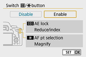 AF taško pasirinkimo ir AE užrakto mygtukų sukeitimas