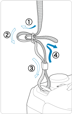 Iš apačios prakiškite dirželio galą pro fotoaparato korpuse esančią dirželio kilputę, tada prakiškite jį pro dirželio sagtį (žr. iliustraciją). Patraukite dirželį ir priveržkite taip, kad jis neatsilaisvintų nuo sagties.