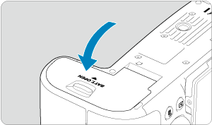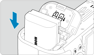 Į fotoaparatą įdėkite visiškai įkrautą baterijų paketą LP-E6NH (arba LP-E6P/LP-E6N/LP-E6).
