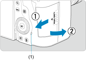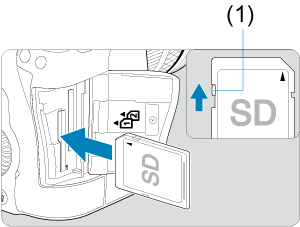 - Kad galėtumėte rašyti ir trinti duomenis įsitikinkite, kad atminties kortelės apsaugos nuo įrašymo jungiklis (1) yra pastumtas aukštyn.
