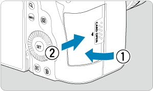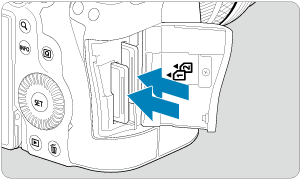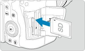 - Kaip parodyta iliustracijoje, atminties kortelę pasukite taip, kad etiketė būtų nukreipta į Jus, ir įkiškite taip, kad spragtelėdama užsifiksuotų.
