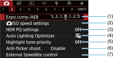 - (1) Expo.comp./AEB (Skirtingų automatinių ekspozicijos parametrų serija (AEB))