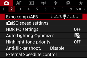 - AEB negalima naudoti fotografuojant su blykste arba neriboto eksponavimo metu, naudojant daugybinių kadrų iškraipymų mažinimą, HDR režimą, fokusuotės skirtingų parametrų seriją arba nustačius elektroninį užraktą.