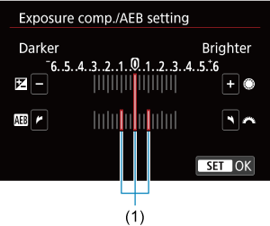 Vykdant skirtingų ekspozicijos parametrų seriją, trys nuosekliai einantys kadrai užfiksuojami nustačius skirtingas ekspozicijas taikant jūsų nurodytą iki ±3 žingsnių (1/3 žingsnio pokyčiu) diapazoną ir automatiškai derinant išlaikymo, diafragmos ir ISO jautrumo reikšmes.