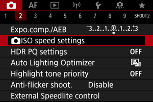 - Norėdami išplėsti galimą ISO jautrumo diapazoną nuo „L“ (atitinka ISO 50) iki „H“ (atitinka ISO 204800), derinkite parinktį [ISO speed range/ISO jautrumo diapazonas], esančią [