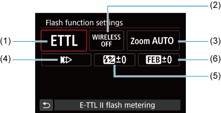 - [E-TTL II flash metering/E-TTL II blykstės matavimas] yra standartinis EL/EX serijos „Speedlite“ blyksčių automatinio veikimo režimas.