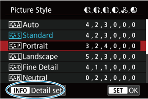, kad įrašytumėte suderintą nuostatą ir grįžtumėte į „Picture Style“ sąrankos pasirinkimo ekraną.