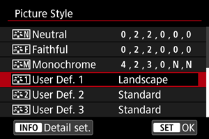 - Pagrindinė „Picture Style“ sąranka bus rodoma parinkties [User Def. */Naudotojo apibr.*] dešinėje.