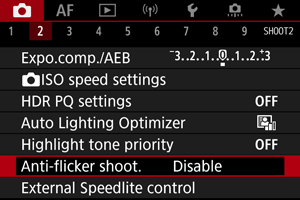 , pasirinkdami [Anti-flicker shoot./Fotografavimas sumažinant mirgėjimą] ir paspausdami mygtuką
