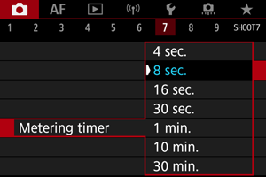 Galite nustatyti, kiek laiko veikia matavimo laikmatis (tai nulemia ekspozicijos rodinio / AE fiksavimo trukmę) po to, kai jį įjungia atliktas veiksmas, pavyzdžiui, užrakto mygtuko paspaudimas iki pusės.