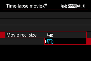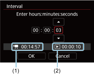 Žymi filmo įrašymo trukmę (laiko trukmę, reikalingą filmui peržiūrėti) kuriant 4K arba „Full HD“ formato fotofilmą naudojant nustatytu intervalu užfiksuotas nuotraukas.