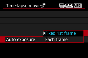 - Dėl reikšmingų skaisčio pasikeitimų tarp kadrų fotoaparatas gali nenufotografuoti nurodytu intervalu, kai nustatyta trumpesnė nei 3 sek. parinkties [Interval/Intervalas] nuostata ir nustatyta parinkties [Auto exposure/Automatinė ekspozicija] nuostata [Each frame/Kiekvienas kadras].