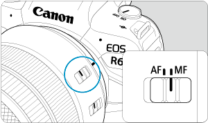 - Kai objektyvo fokusavimo režimo jungiklis perjungtas į padėtį