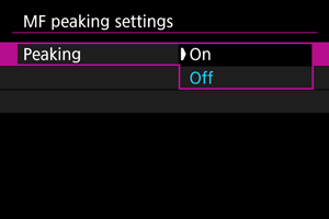 - MF maksimizavimą gali būti sunku įžiūrėti, kai naudojamas didelis ISO jautrumas, ypač, kai nustatytas ISO išplėtimas. Jei būtina, nustatykite mažesnį ISO jautrumą arba nustatykite parinkties [Peaking/Maksimizavimas] nuostatą [Off/Išjungti].