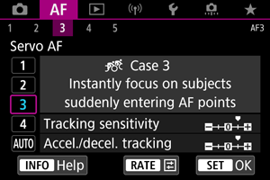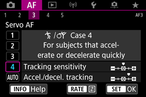 Nuostata, skirta nustatyti „AI Servo AF“ / „Servo AF“ objekto sekimo jautrumą reaguojant į staigius ir smarkius greičio pasikeitimus, kaip kad būna objektams staiga pradėjus ar nustojus judėti.