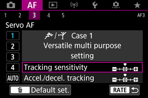 - Pabandykite nustatyti parinkties [Tracking sensitivity/Sekimo jautrumas] nuostatą [–2], jei sufokusuojami objektai, kurie nėra fotografavimo objektai, arba AF taškai nemažą laiko dalį nuklysta nuo fotografavimo objekto ir fotoaparatas negali sekti tikslinio objekto, kai nustatytos numatytosios nuostatos ().