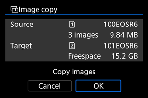 Jei paskirties aplanke arba kortelėje yra to paties numerio vaizdo failas, rodomos parinktys [Skip image and continue/Praleisti vaizdą ir tęsti], [Replace existing image/Pakeisti esamą vaizdą] ir [Cancel copy/Atšaukti kopijavimą]. Pasirinkite kopijavimo metodą ir paspauskite
