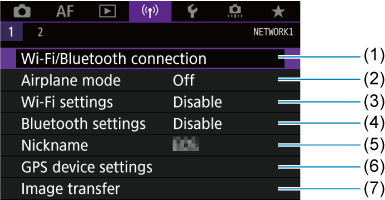 Skirtukų meniu: Belaidžio ryšio funkcijos