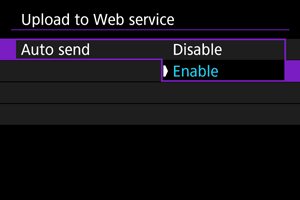 - Kai pasirinksite [Enable/Įjungti], įjungus fotoaparatą, vaizdai bus automatiškai siunčiami.