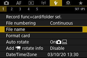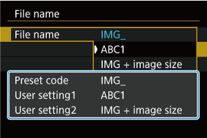 Failų pavadinimą sudaro keturi skaitiniai-raidiniai simboliai, po kurių eina keturženklis failo numeris (), ir failo plėtinys. Galite pakeisti pirmus keturis skaitinius-raidinius simbolius, kurie pagal numatytąsias nuostatas yra unikalūs kiekviename fotoaparate ir nustatomi prieš išsiunčiant fotoaparatą.