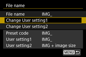 Naudotojo nuostata 1 suteikia galimybę užregistruoti pasirinktinius keturis simbolius. Naudotojo nuostata 2 prideda tris pradinius pasirinktinius užregistruotus simbolius prie ketvirto simbolio, žyminčio vaizdo dydį, kuris nufotografavus pridedamas automatiškai.