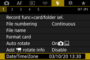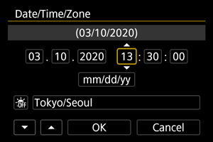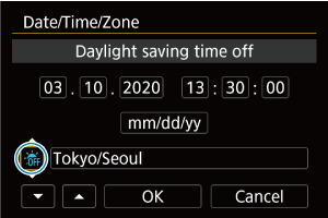 - Pakeitę parinkties [Zone/Time difference/Laiko juosta/laiko skirtumas] nuostatą, patikrinkite, ar teisingai fotoaparatas nustatė laiką ir datą.