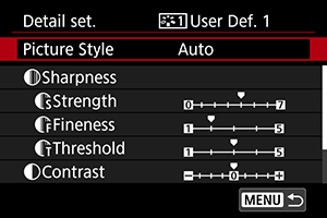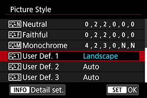 - Pagrindinė „Picture Style“ sąranka bus rodoma parinkties [User Def. */Naudotojo apibr. *] dešinėje.
