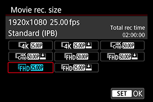 Įrašymo dydį, kadrų dažnį ir glaudinimo metodą galite nustatyti naudodamiesi parinktimi [: Movie rec. size//
