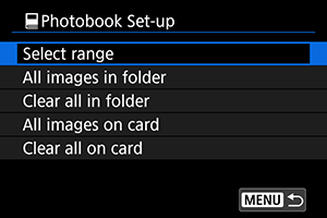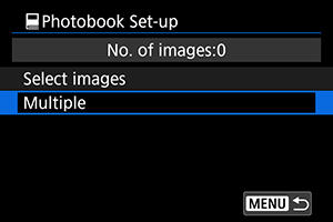 Visi aplanke arba kortelėje esantys vaizdai nurodomi fotoknygai spausdinti, kai pasirenkate nuostatą [All images in folder/Visi vaizdai aplanke] arba [All images on card/Visi vaizdai kortelėje] parinktyje [Multiple/Kiti] (dalyje [: Photobook Set-up/