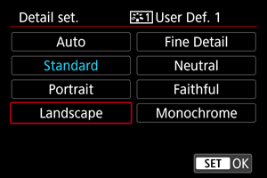 , kad įrašytumėte suderintą nuostatą ir grįžtumėte į „Picture Style“ sąrankos pasirinkimo ekraną.