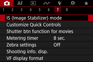 Meniu elementas [IS mode/IS režimas] nerodomas, kai naudojami objektyvai su IS funkcija. Tokiu atveju, nustačius objektyvo vaizdo stabilizavimo jungiklį „Image Stabilizer“ į padėtį , derinamas objektyvo ir fotoaparato vykdomas stabilizavimas.