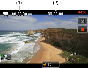 Įrašymo parengties metu rodoma galima įrašymo trukmė. Įrašymo metu rodoma, kiek laiko praėjo nuo filmavimo pradžios (1).