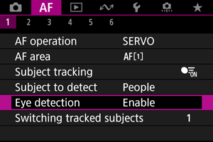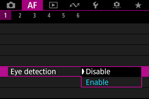 : Akių aptikimas] nuostatą [Enable/Įjungti] ir fotografuoti sufokusavę fotografuojamo objekto akis ()