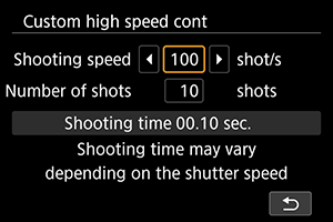 - Nepertraukiamo fotografavimo greitis bus mažesnis, kai fotografuojama mirgančio apšvietimo sąlygomis nustačius [Electronic/Elektroninis]. Taip pat gali būti mažesnis nepertraukiamo fotografavimo greitis, kai nustatyta nuostata [Elec. 1st-curtain/Elektroninis 1-os užuolaidėlės] arba [Mechanical/Mechaninis].