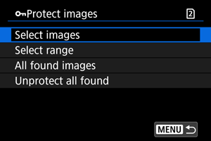 - Norėdami atšaukti apsaugą, pasirinkite [Unprotect all images in folder/Atšaukti visų aplanke esančių vaizdų apsaugą] arba [Unprotect all images on card/Atšaukti visų kortelėje esančių vaizdų apsaugą].