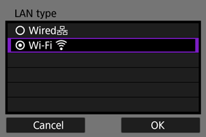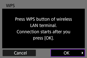 - Išsamios informacijos apie fotoaparato prijungimą prie laidinio LAN tinklo arba ne WPS (PBC režimu) prieigos taškų naudojimą žr. instrukcijose, kurios prasideda Pagrindinės ryšio nuostatos.