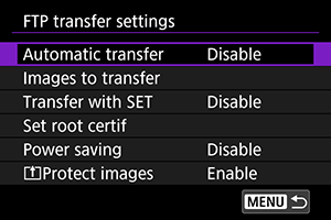 - Jei pageidaujate saugaus FTP perdavimo naudojant šakninį sertifikatą, pasirinkite [FTPS]. Išsamios informacijos apie šakninio sertifikato nuostatas žr. FTPS šakninio sertifikato importavimas.