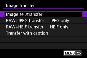 - Pasirinkite [RAW+HEIF transfer/RAW+HEIF perdavimas], po to pasirinkite [HEIF only/Tik HEIF], [RAW only/Tik RAW] arba [RAW+HEIF].