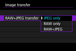 - Pasirinkite [RAW+JPEG transfer/RAW+JPEG perdavimas], po to pasirinkite [JPEG only/Tik JPEG], [RAW only/Tik RAW] arba [RAW+JPEG].