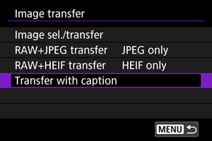 - Kitų vaizdų ekrane [Transfer with caption/Perdavimas su titrais] pasirinkti negalima. Norėdami pasirinkti kitą su titru perduotiną vaizdą, peržiūrėkite tą vaizdą prieš atlikdami nurodytus veiksmus.