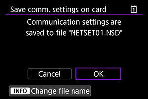 : Įrašyti / įkelti nuostatas kortelėje] suteikia galimybę įrašyti visas fotoaparate esančias ryšio nuostatas į kortelę arba iš kortelės įkelti visas kito fotoaparato ryšio nuostatas.