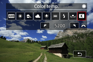 ] reikšmę, kuri buvo išmatuota parduotuvėje įsigytu spalvos temperatūros matuokliu, iš anksto padarykite kelis bandomuosius kadrus ir sureguliuokite nuostatą taip, kad būtų kompensuotas skirtumas tarp spalvos temperatūros matuoklio rodmens ir fotoaparato spalvos temperatūros rodmens.