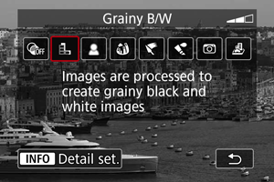 - Naudojant režimą [Grainy B/W/Grūdėtas nespalvotas], grūdėto vaizdo peržiūra kažkiek skirsis nuo vaizdo kadre.