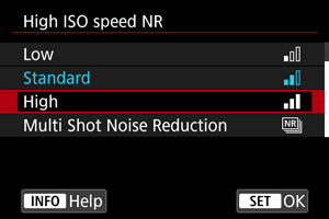Galite sumažinti sukeltų vaizdo iškraipymų. Ši funkcija ypač veiksminga, kai fotografuojama nustačius didelį ISO jautrumą. Kai fotografuojama nustačius mažą ISO jautrumą, galima dar labiau sumažinti tamsesnėse vaizdo dalyse (kuriose yra šešėlių) pasitaikančius vaizdo iškraipymus.