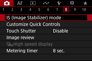 Fotografuojant, fotoaparate įdiegta vaizdo stabilizavimo funkcija sumažina fotoaparato drebėjimą. Naudodami objektyvus be IS funkcijos, nustatykite parinkties [IS mode/IS režimas] nuostatą [On/Įjungti] kaip nurodyta toliau. Naudojant objektyvus su IS funkcija, fotoaparato drebėjimas sumažinamas naudojant tiek fotoaparato, tiek objektyvo stabilizavimą. Kai naudojami objektyvai su IS funkcija, ant kurių nėra IS jungiklio, nustatykite parinkties [IS mode/IS režimas] nuostatą [On/Įjungti]. Atkreipkite dėmesį, kad objektyvų su IS funkcija ir IS jungikliu atveju, nuostata [IS mode/IS režimas] yra pilkos spalvos. Tokiu atveju, nustačius objektyvo IS jungiklį į padėtį , derinamas fotoaparato ir objektyvo stabilizavimas.