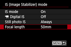 Vaizdo stabilizavimas remiantis jūsų nurodytu židinio nuotoliu galimas naudojant objektyvus, nepalaikančius ryšio su objektyvu funkcijos, ir nustatant židinio nuotolį.