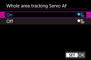 Galite nustatyti, ar turėtų būti įjungtas objekto sekimas visoje zonoje, kai įjungtas „Servo AF“ (kai užrakto mygtukas nuspaustas iki pusės tuomet, kai nustatyta parinkties [: AF operation/