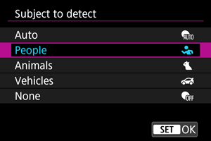 Kai objektui pasirinkti užrakto mygtukas nuspaudžiamas iki pusės, galite pasirinkti toliau nurodytus objektus. Aplinkose, kai nėra atitinkamų objektų, fotoaparatas seka kitus objektus, neatsižvelgdamas į parinkties [Subject to detect/Aptiktinas objektas] nuostatą.