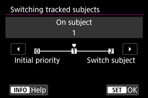 - Jei norite ir toliau fokusuoti iš pradžių nustatytą pagrindinį objektą, apsvarstykite galimybę naudoti nuostatą [Initial priority/Pradinis pirmumas] arba [On subject/Į objektą].