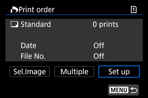 - RAW/HEIF vaizdų ir filmų nurodyti spausdinti negalima. Atminkite, kad RAW/HEIF vaizdų ir filmų negalima nurodyti spausdinti net ir nurodžius visus vaizdus pasirinkus nuostatą [Multiple/Keli].